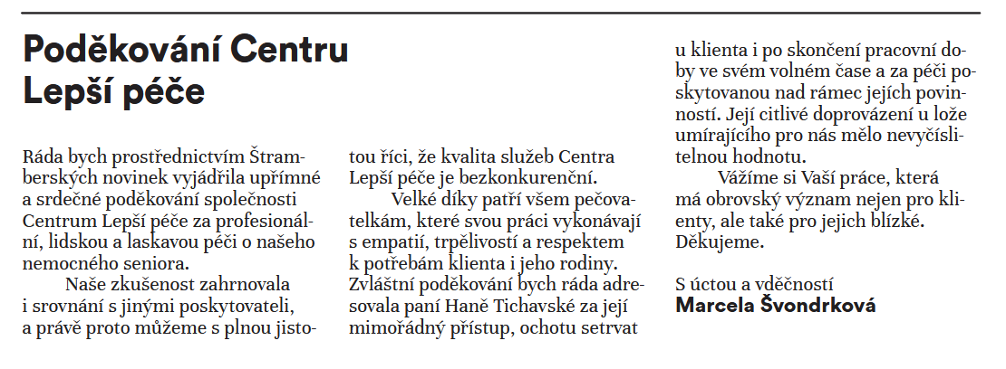 Poděkování Centru Lepší péče